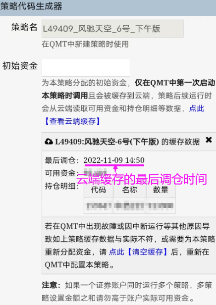 方法一:策略空仓时,首先在QMT中关闭策略,然后进入本系统点开对应策略 - 自动交易入口 - 查看云端缓存 - 清空缓存,然后重新设置策略初始资金,重新生成代码,去迅投QMT
