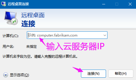 在本地电脑使用远程桌面登录云服务器的方法:开始 - 运行 - mstsc - 确定 - 输入云服务器公网IP - 连接。